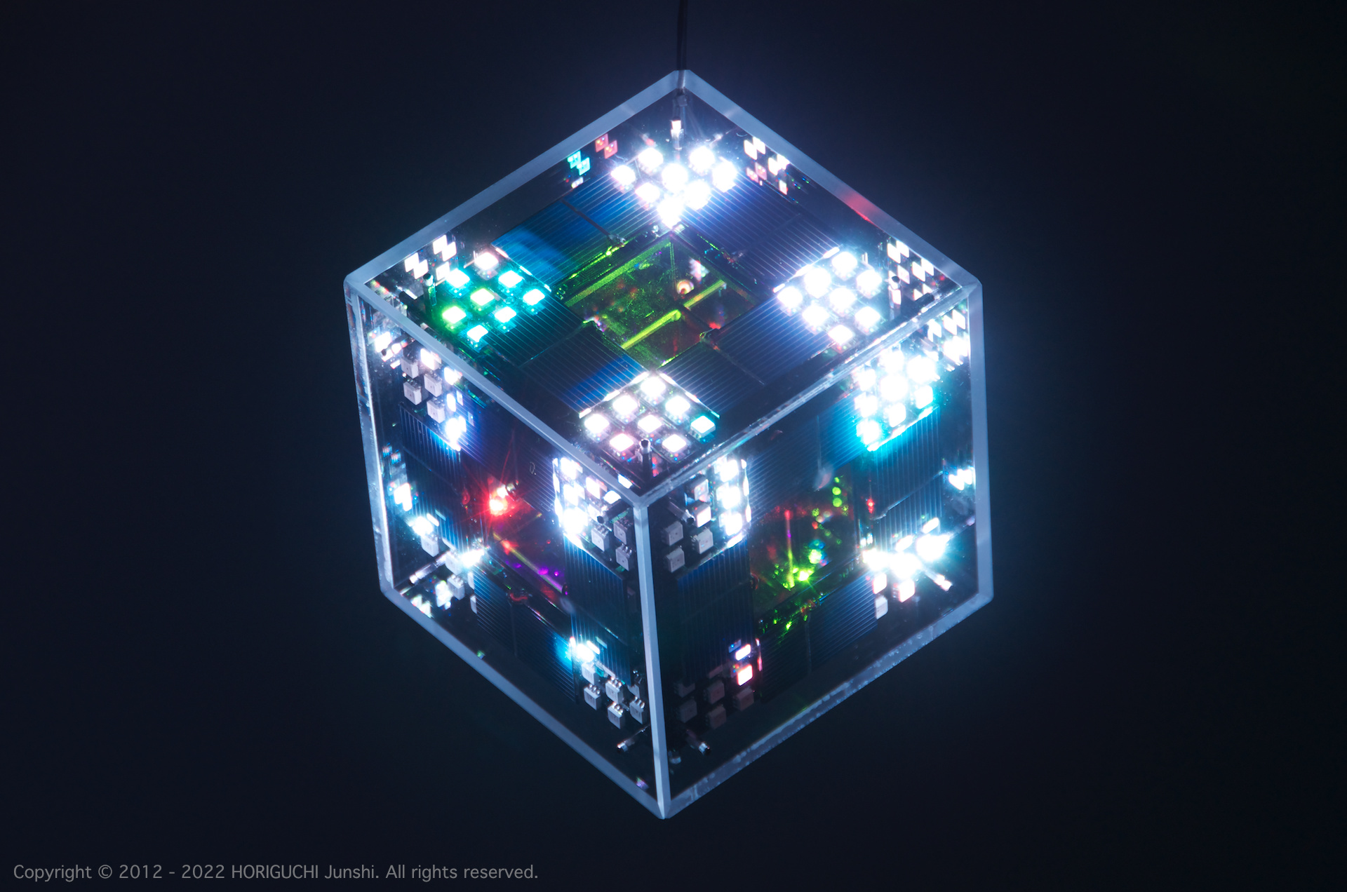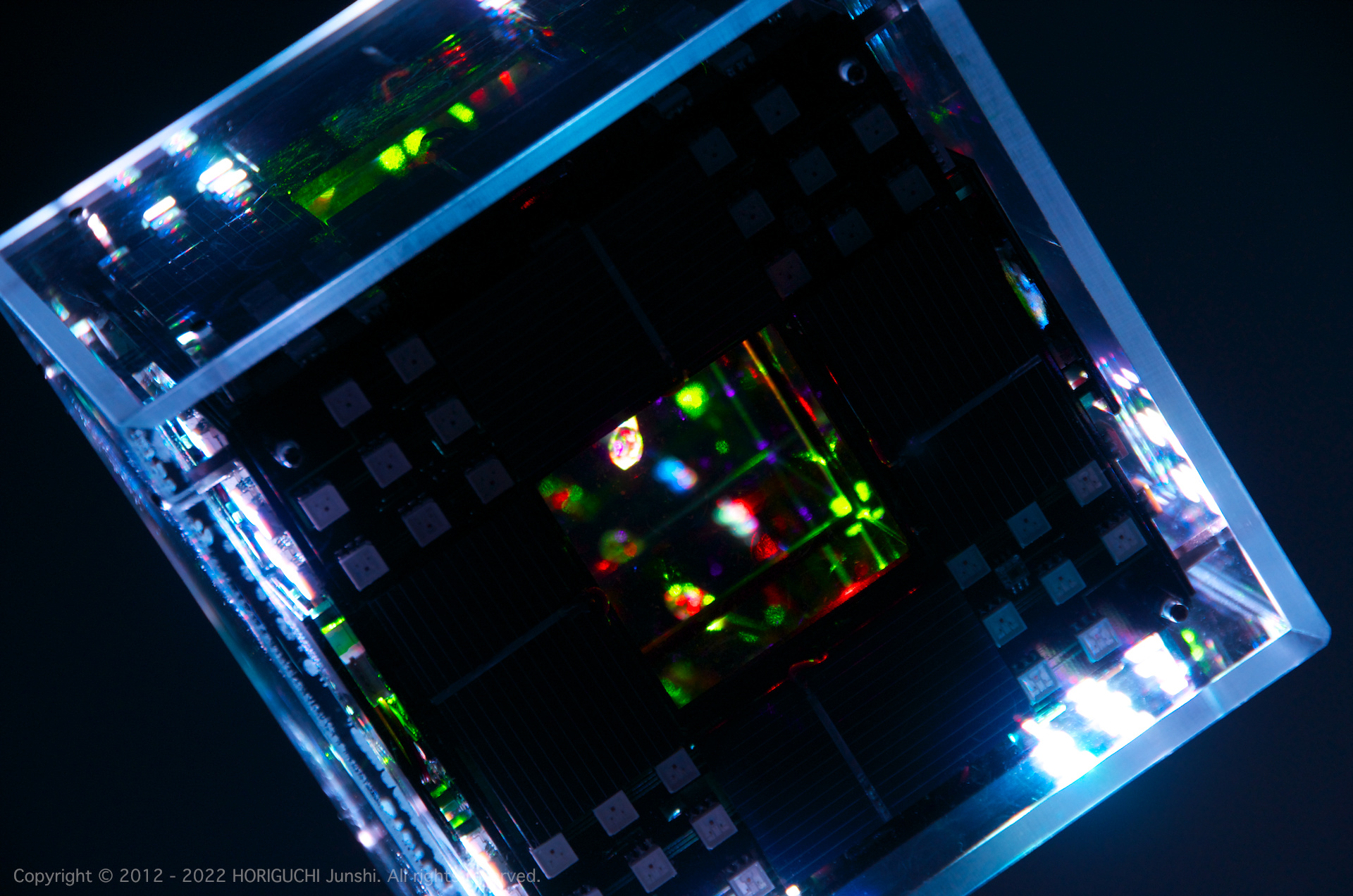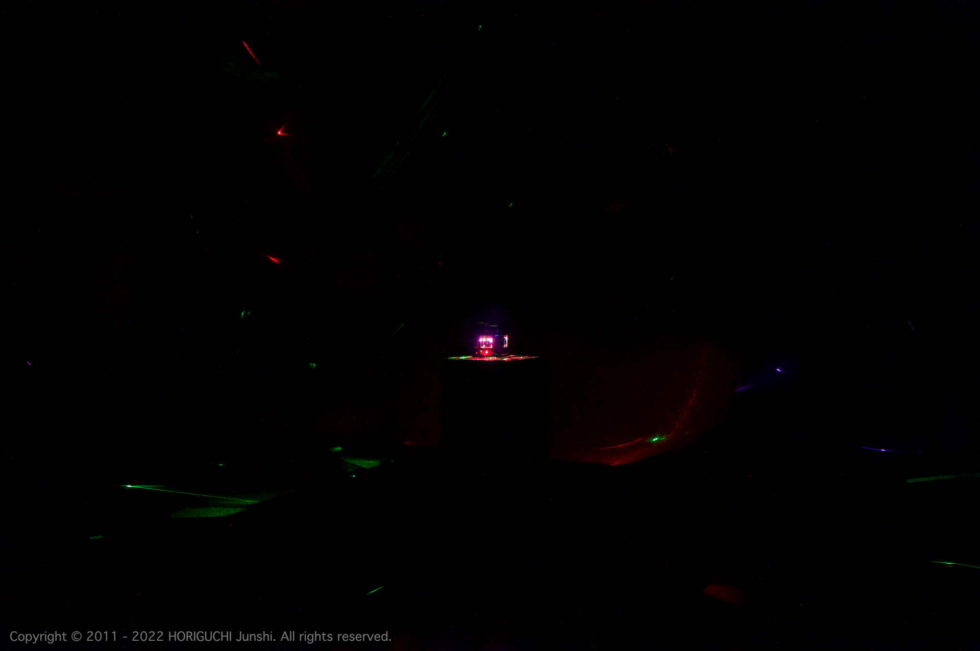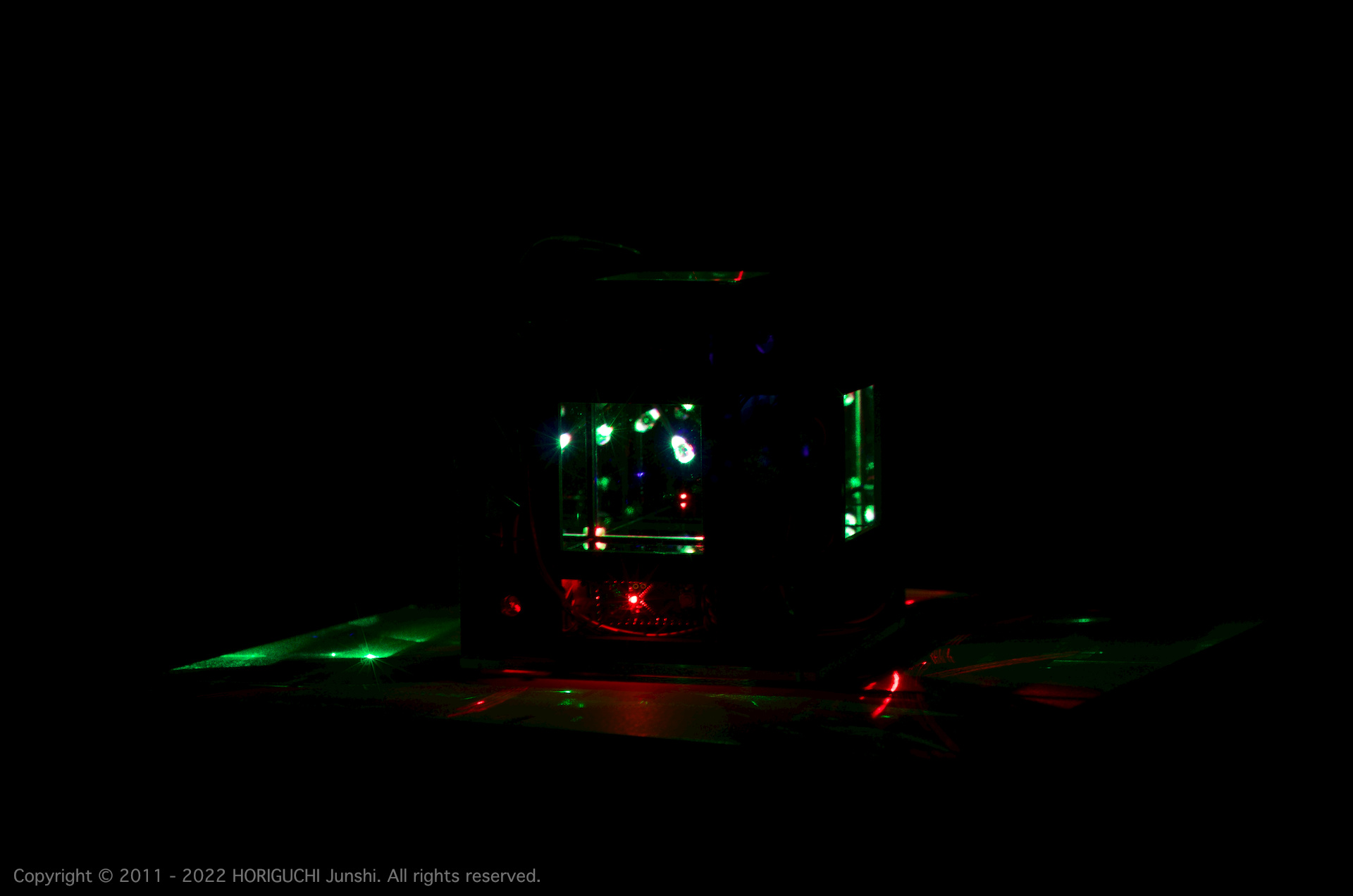LED は3色のそれぞれの次元において、独立したセルオートマトンのアルゴリズムによって光のパターンを変化させ、作品の表層で混色される。3色のレーザは作品の最奥部から照射され、回転するクリスタル・6枚のハーフミラー・24枚のガラスミラーからなる万華鏡をとおして、作品の外部に放射される。