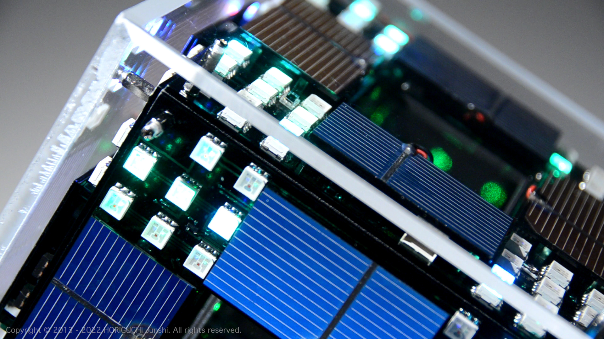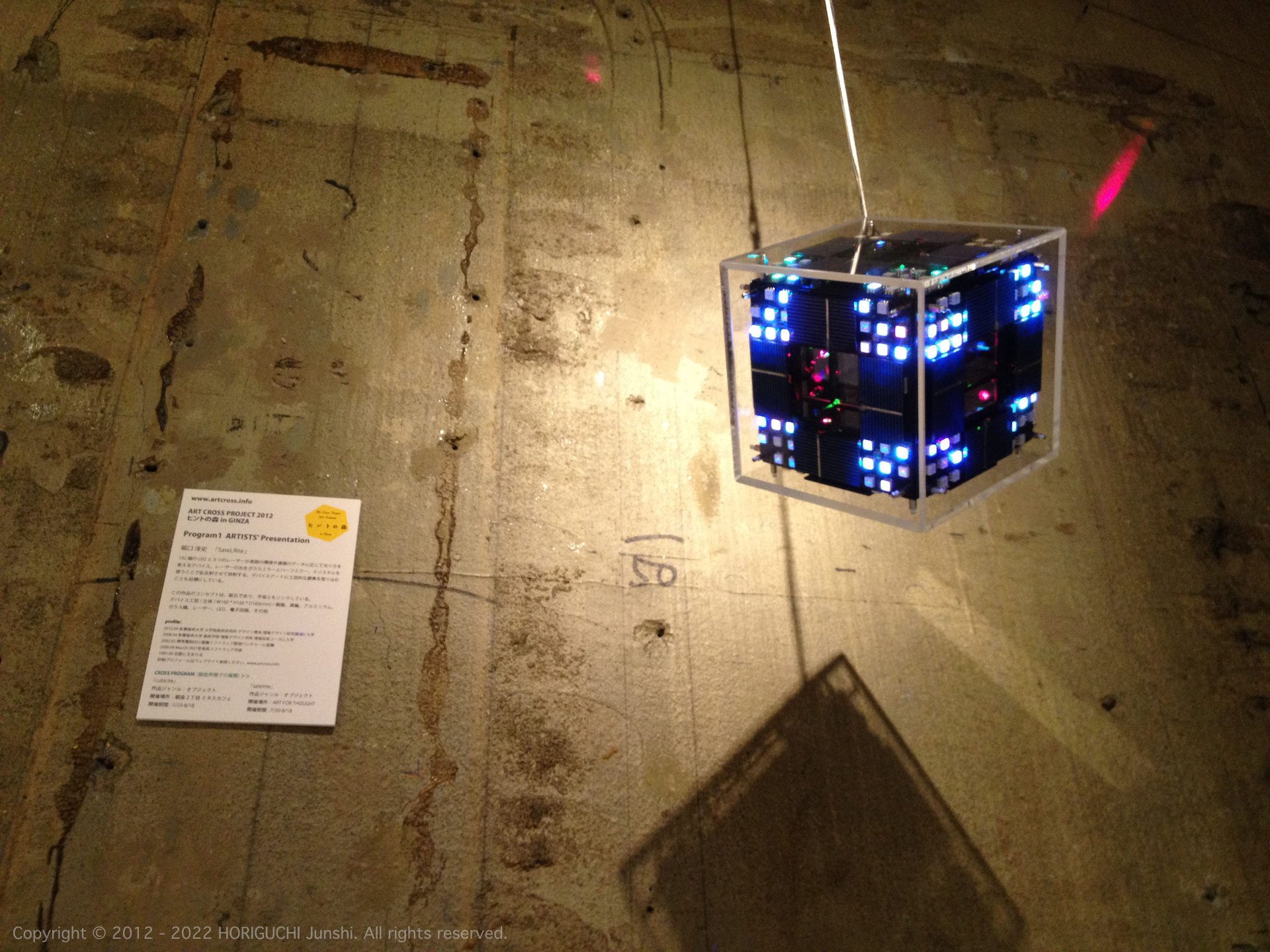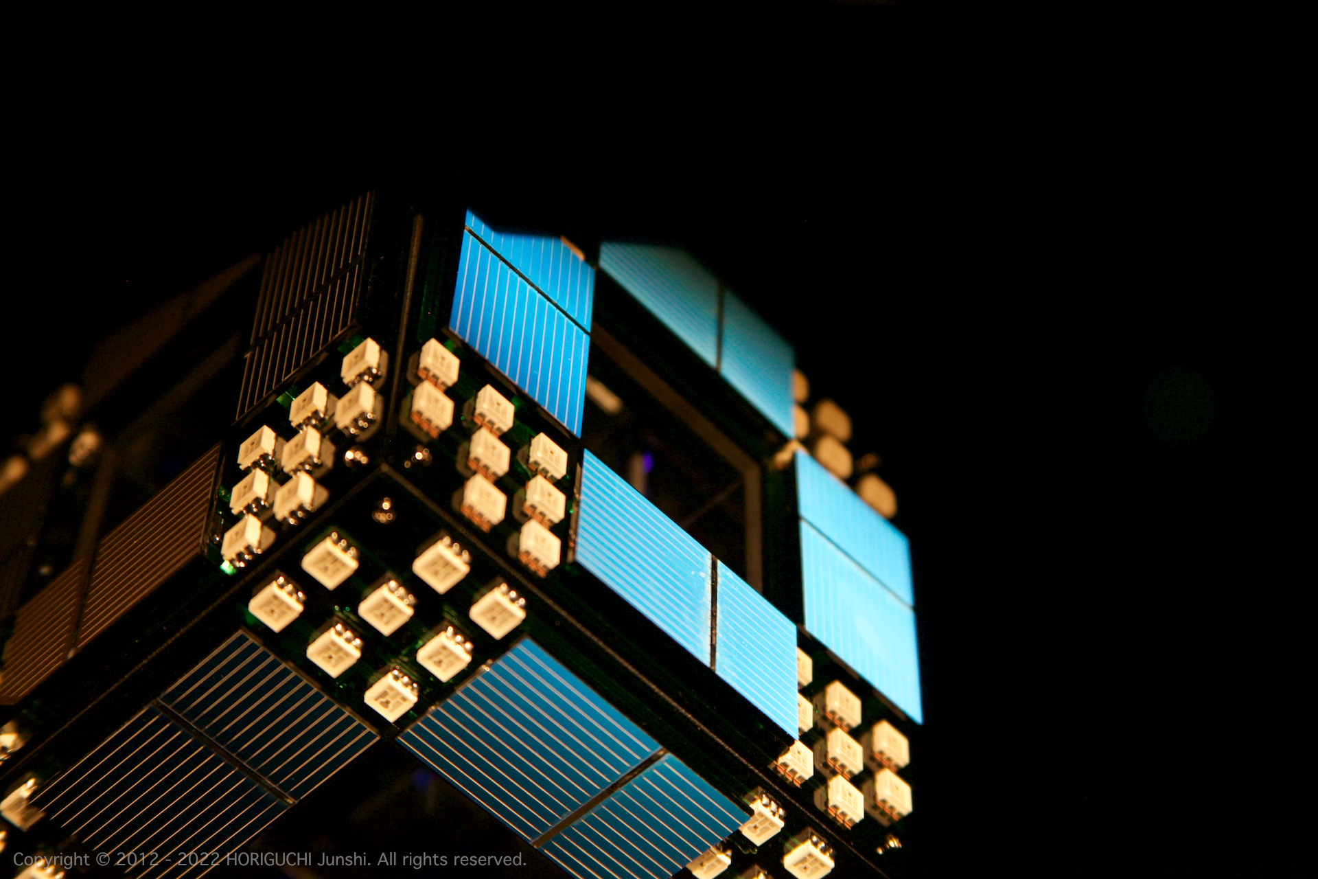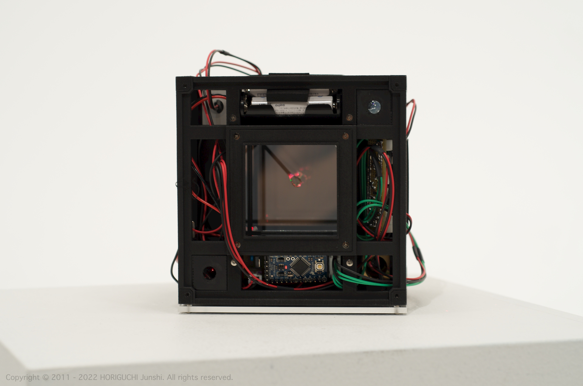 LED は3色のそれぞれの次元において、独立したセルオートマトンのアルゴリズムによって光のパターンを変化させ、作品の表層で混色される。3色のレーザは作品の最奥部から照射され、回転するクリスタル・6枚のハーフミラー・24枚のガラスミラーからなる万華鏡をとおして、作品の外部に放射される。