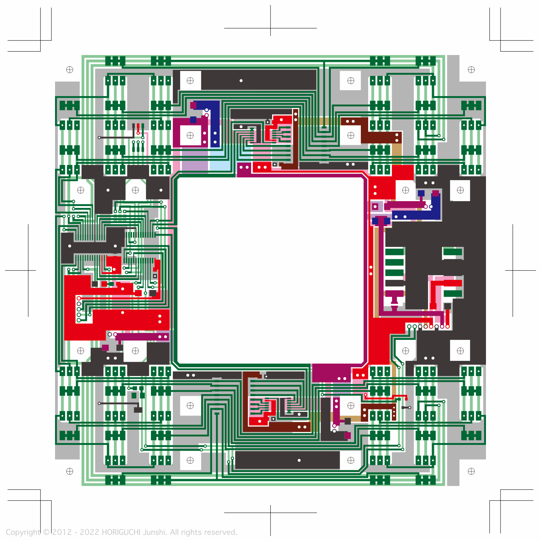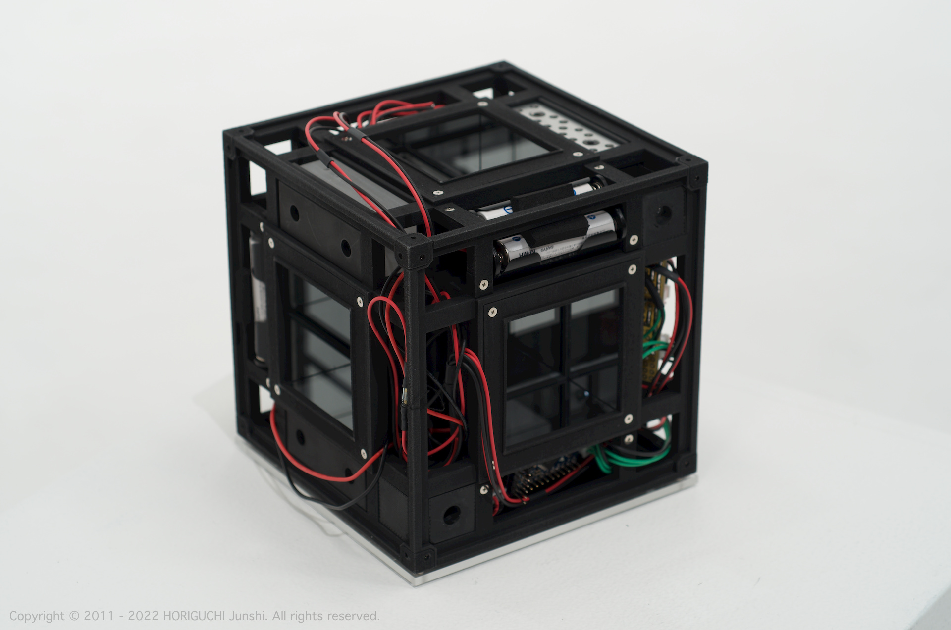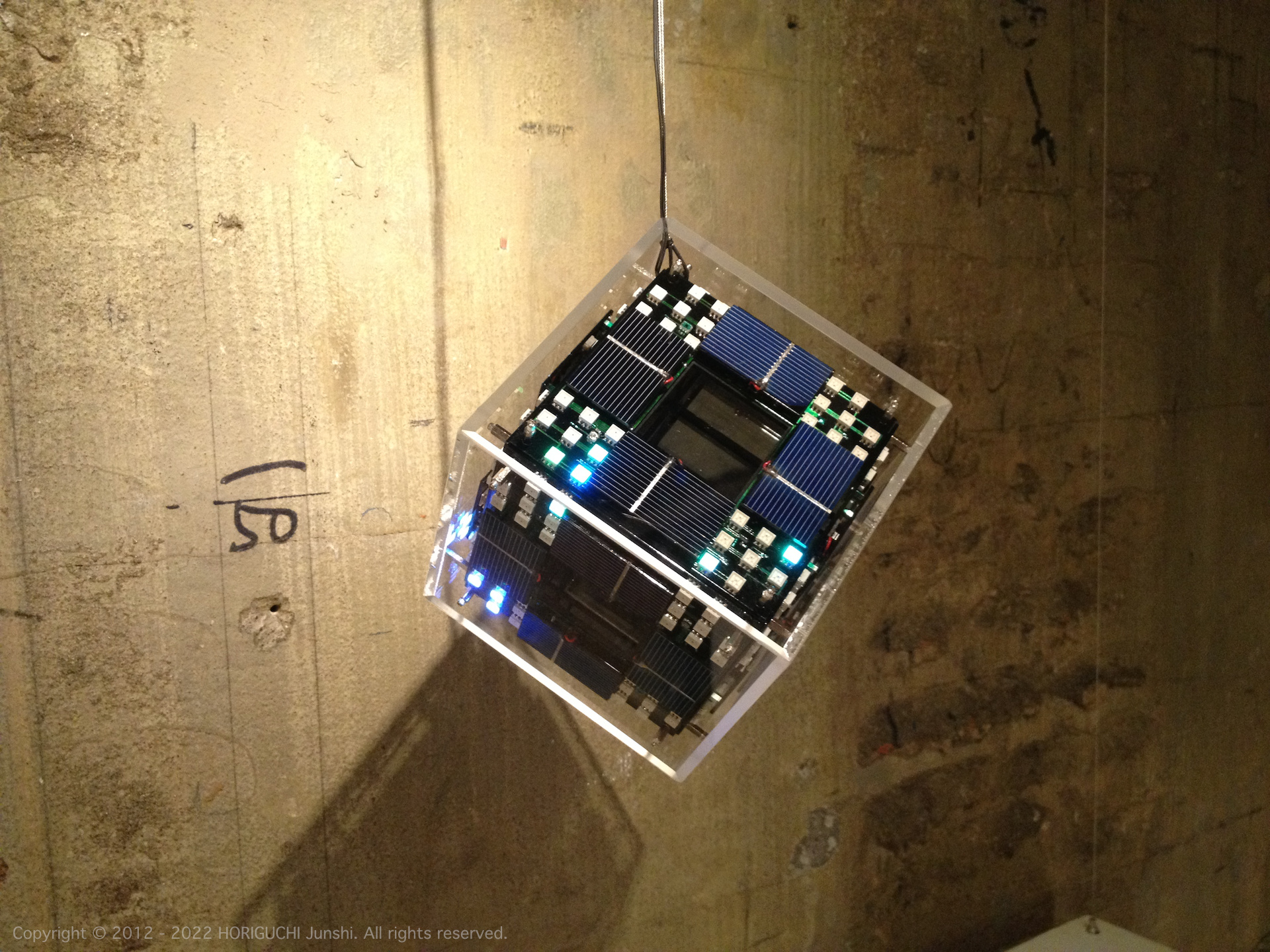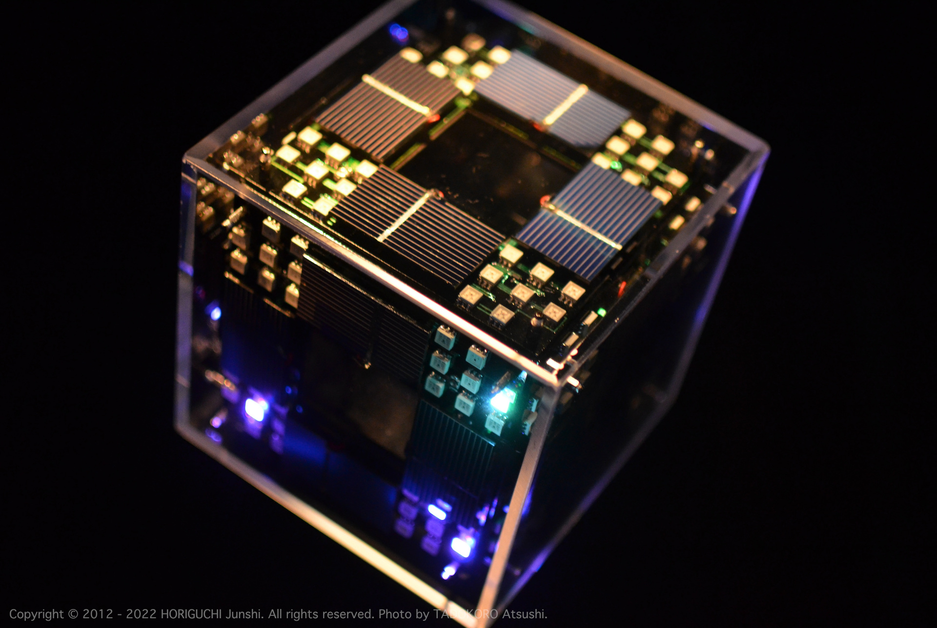 LED は3色のそれぞれの次元において、独立したセルオートマトンのアルゴリズムによって光のパターンを変化させ、作品の表層で混色される。3色のレーザは作品の最奥部から照射され、回転するクリスタル・6枚のハーフミラー・24枚のガラスミラーからなる万華鏡をとおして、作品の外部に放射される。