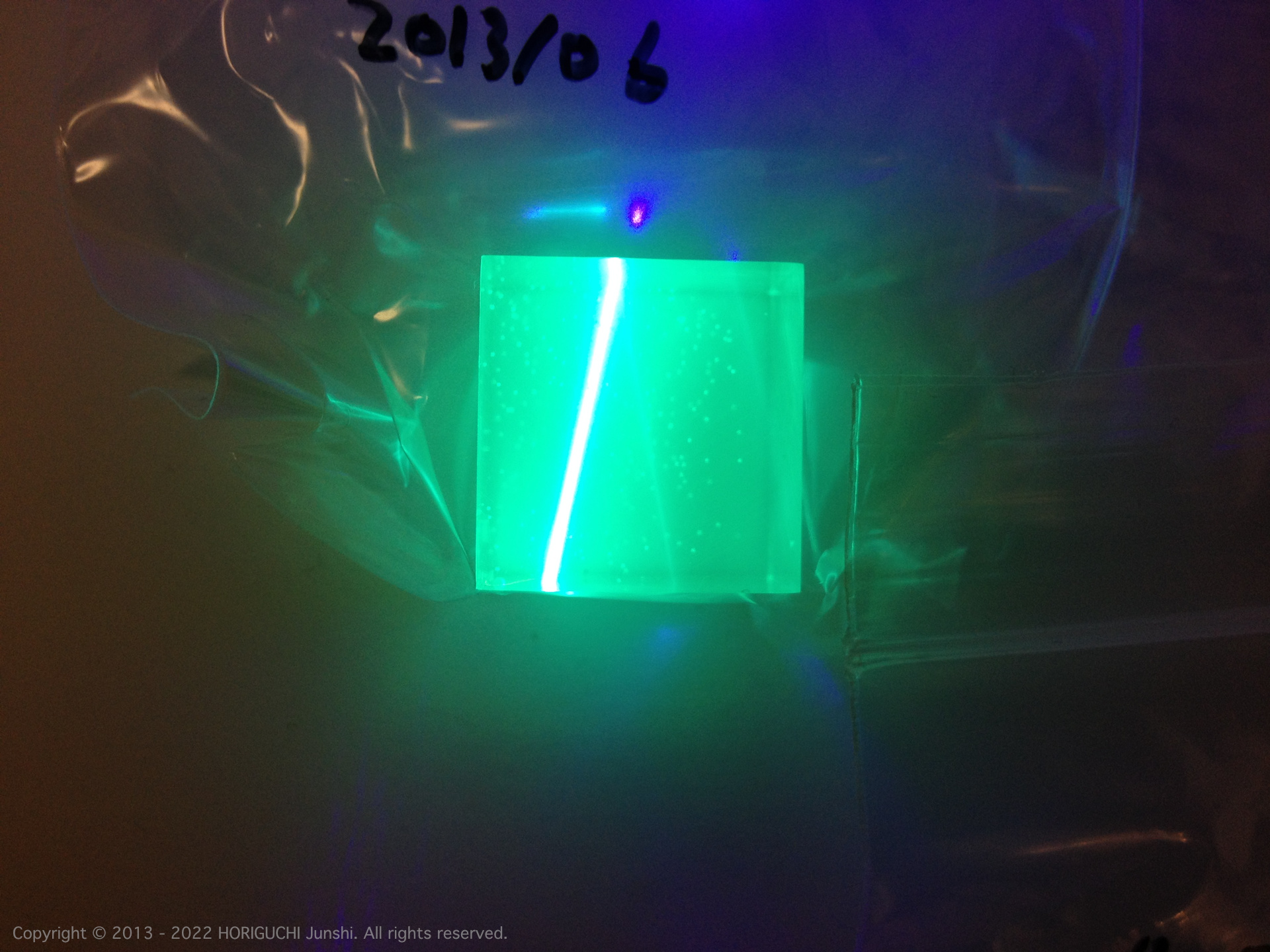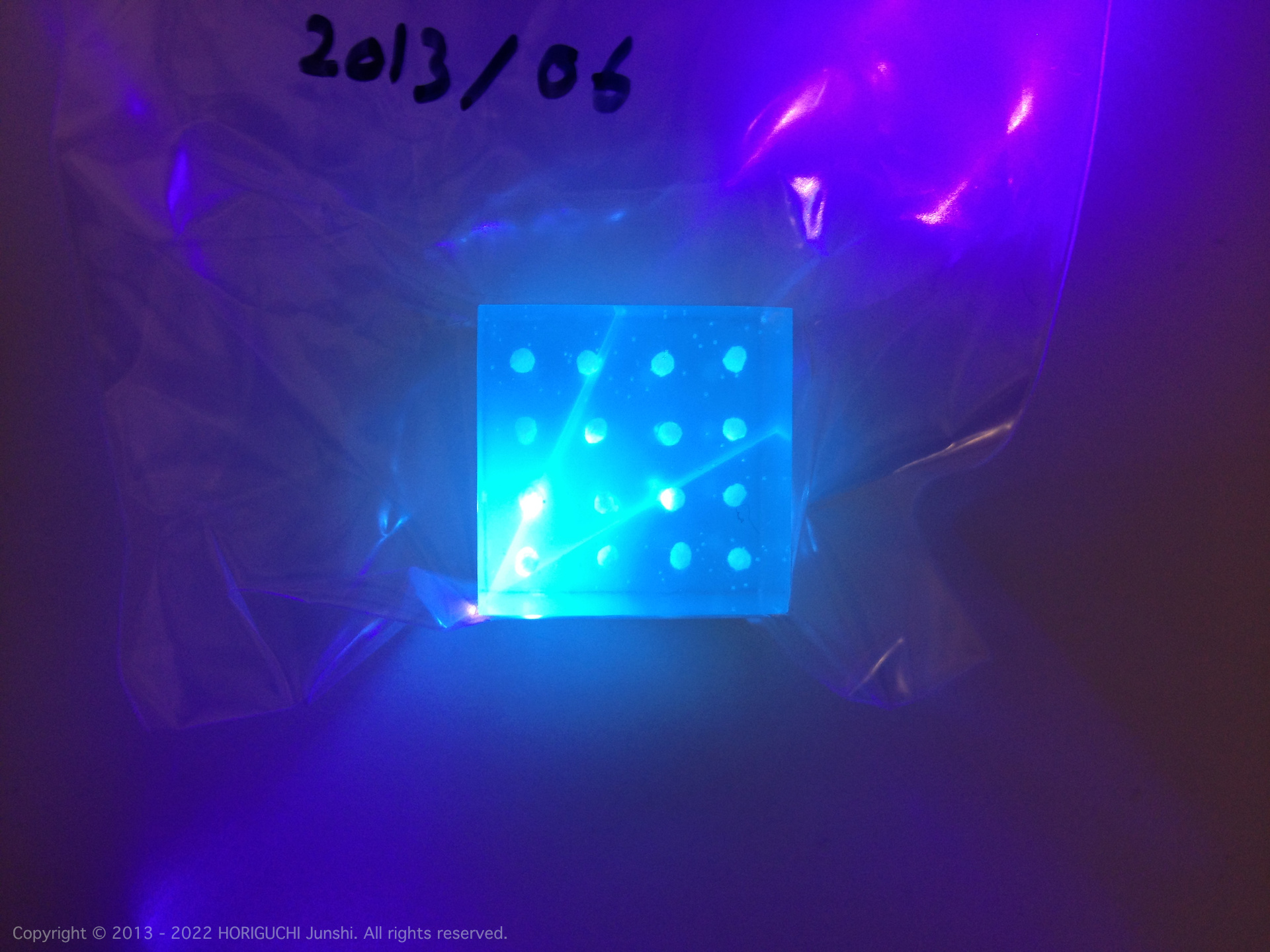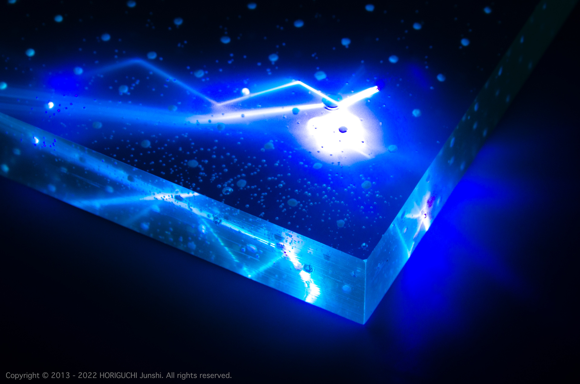 エポキシ樹脂からなる W160 × H20 × D160mm の板の内部には、225 個の白色蓄光素材の粒が格子点状に並べられている。エポキシ樹脂は蛍光性の染料で着色されており、紫外線に反応して青紫色〜青緑色の光を発する。紫外線レーザ光線が板に入射すると光の軌跡が描き出され、光線の入射がなくなると励起された蓄光素材により幻影が表出する。