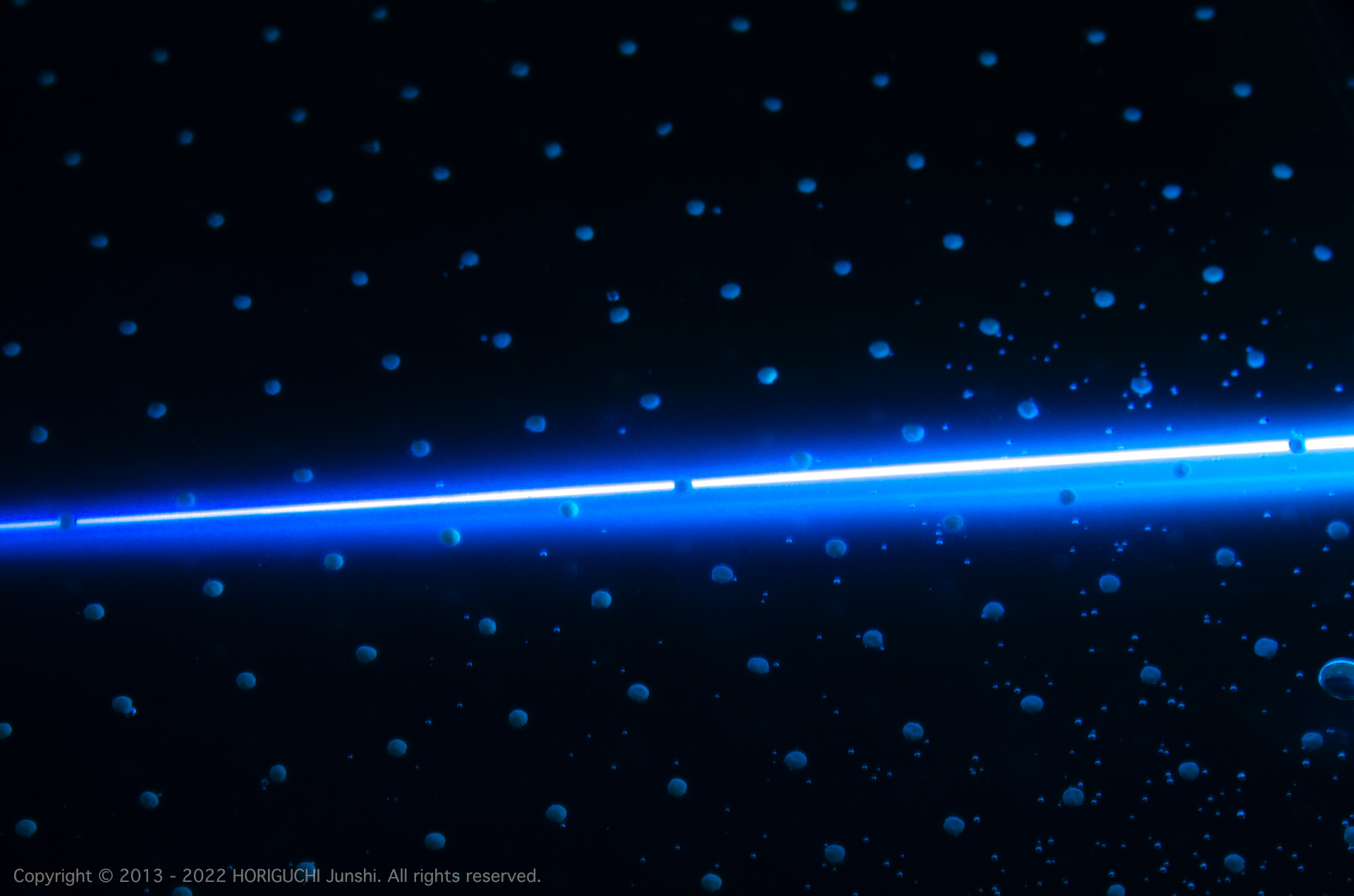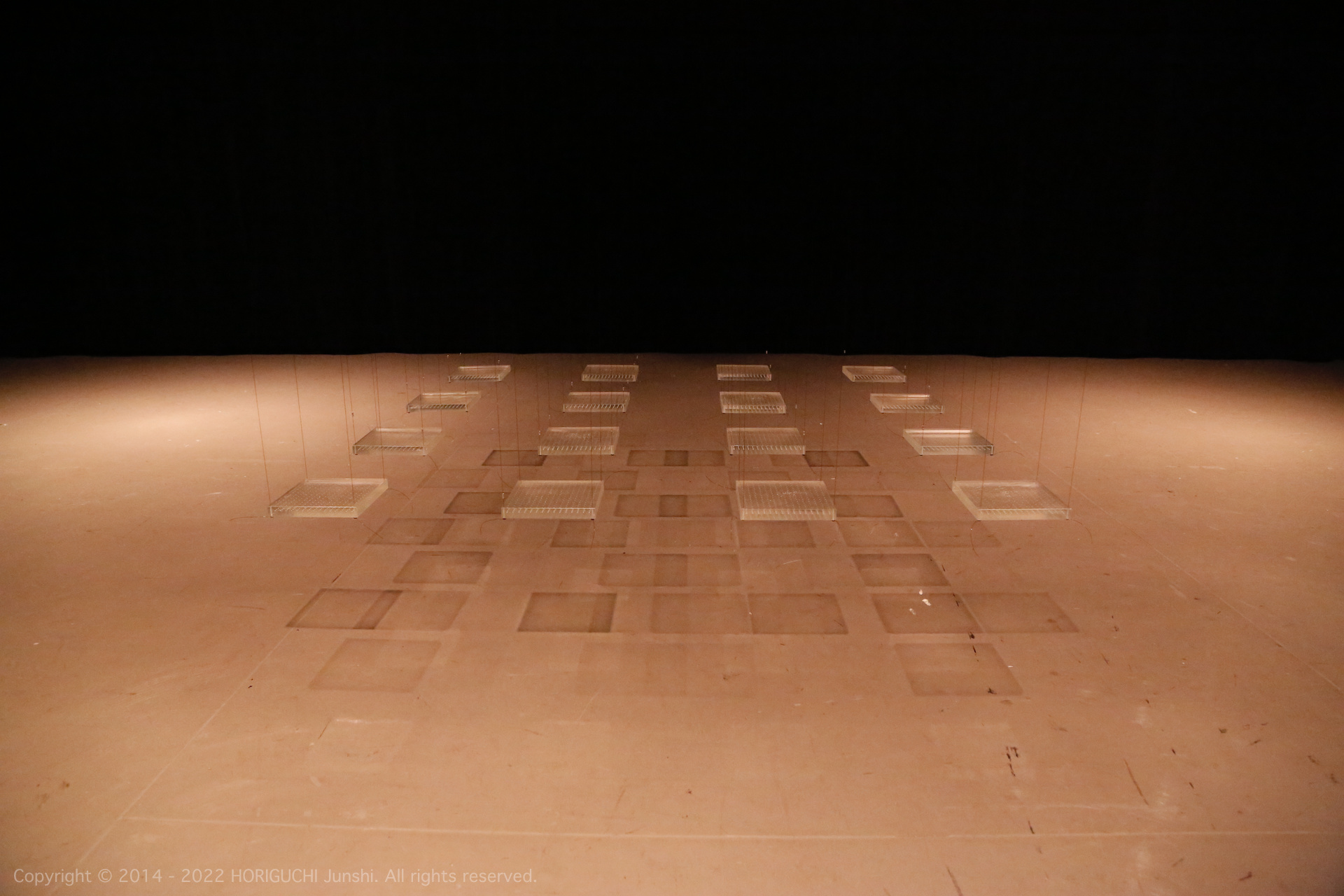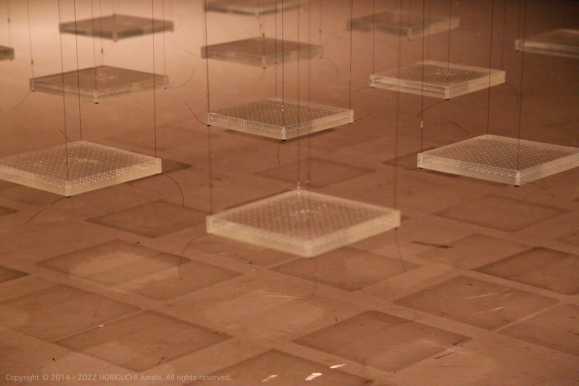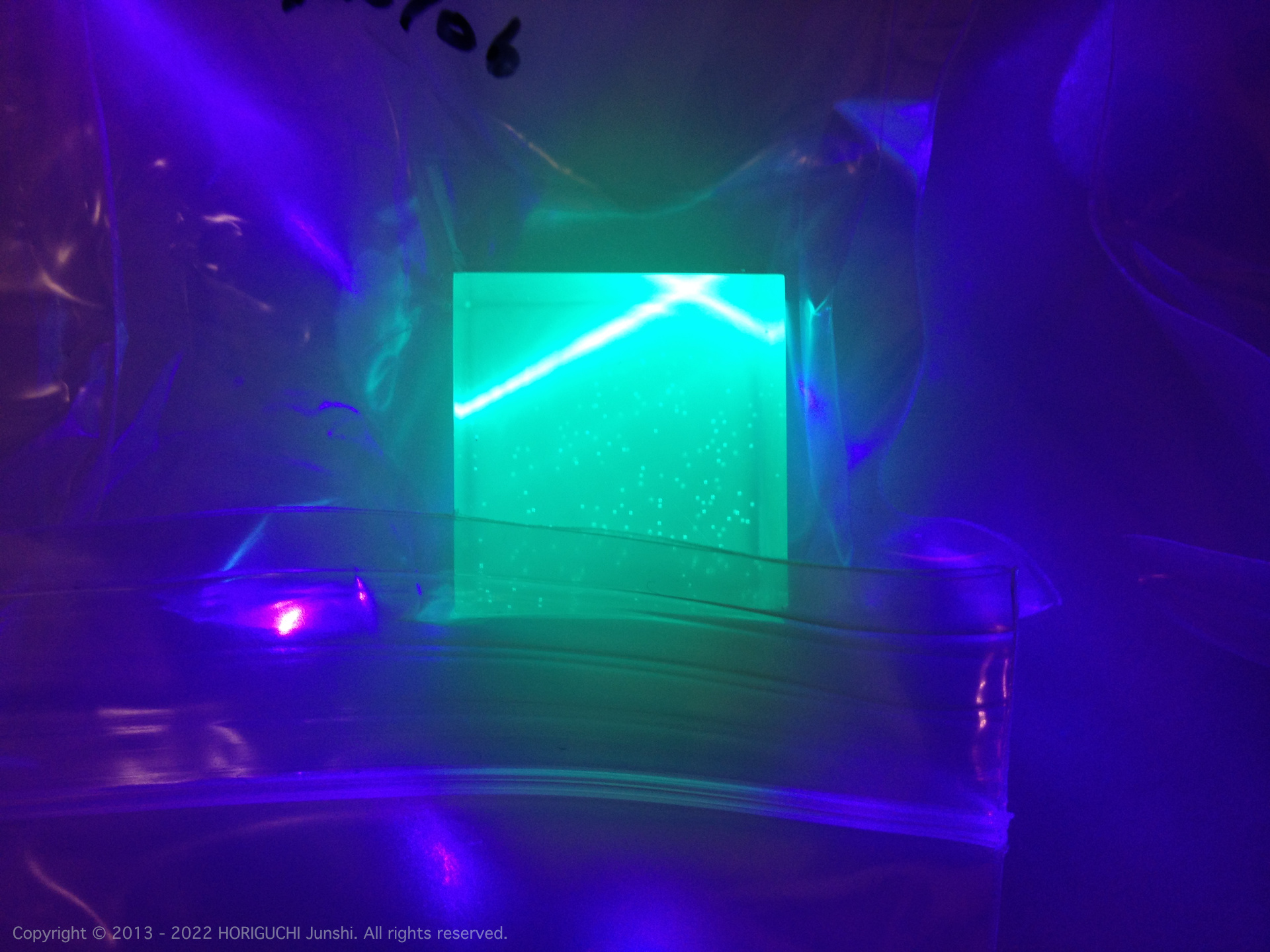 エポキシ樹脂からなる W160 × H20 × D160mm の板の内部には、225 個の白色蓄光素材の粒が格子点状に並べられている。エポキシ樹脂は蛍光性の染料で着色されており、紫外線に反応して青紫色〜青緑色の光を発する。紫外線レーザ光線が板に入射すると光の軌跡が描き出され、光線の入射がなくなると励起された蓄光素材により幻影が表出する。