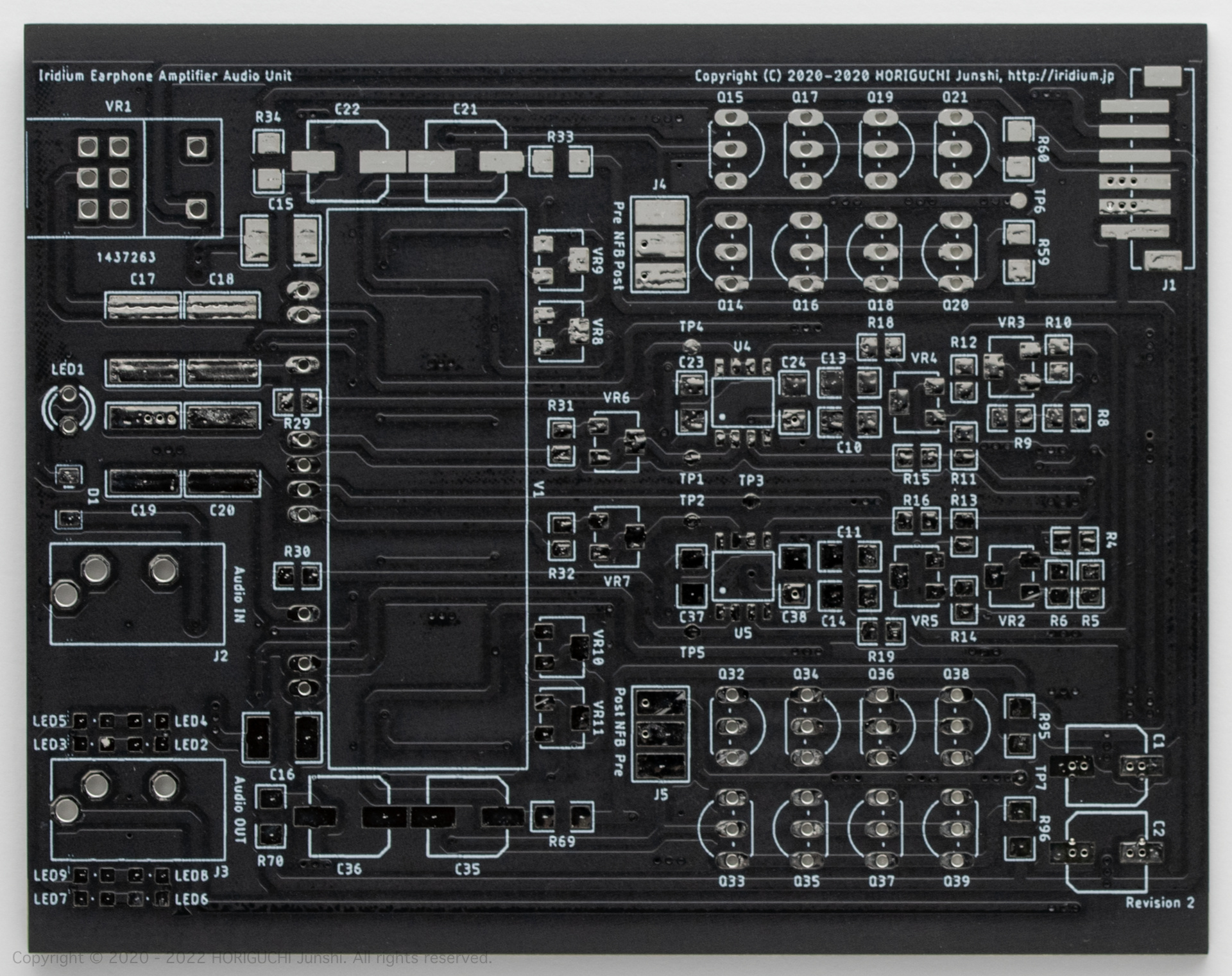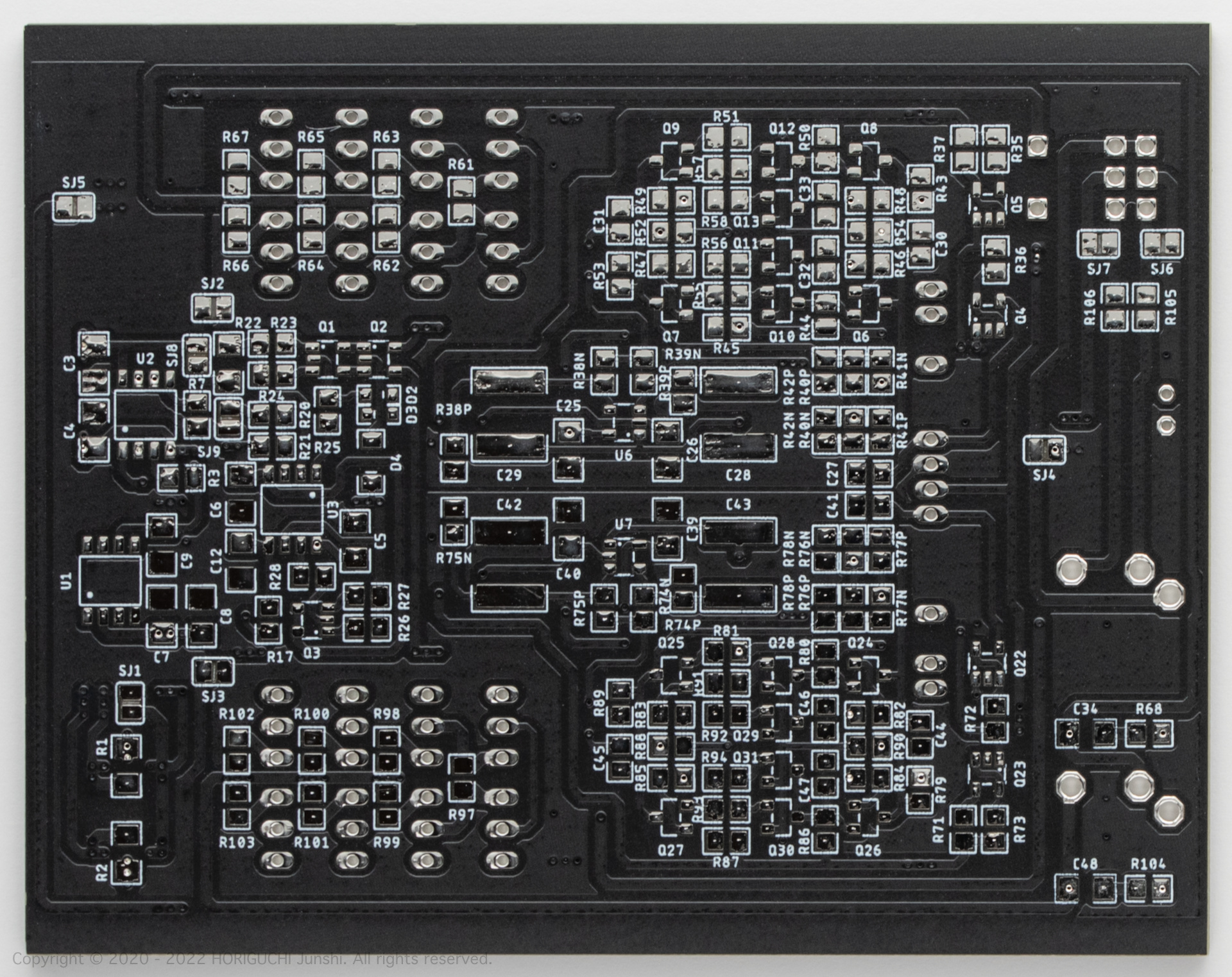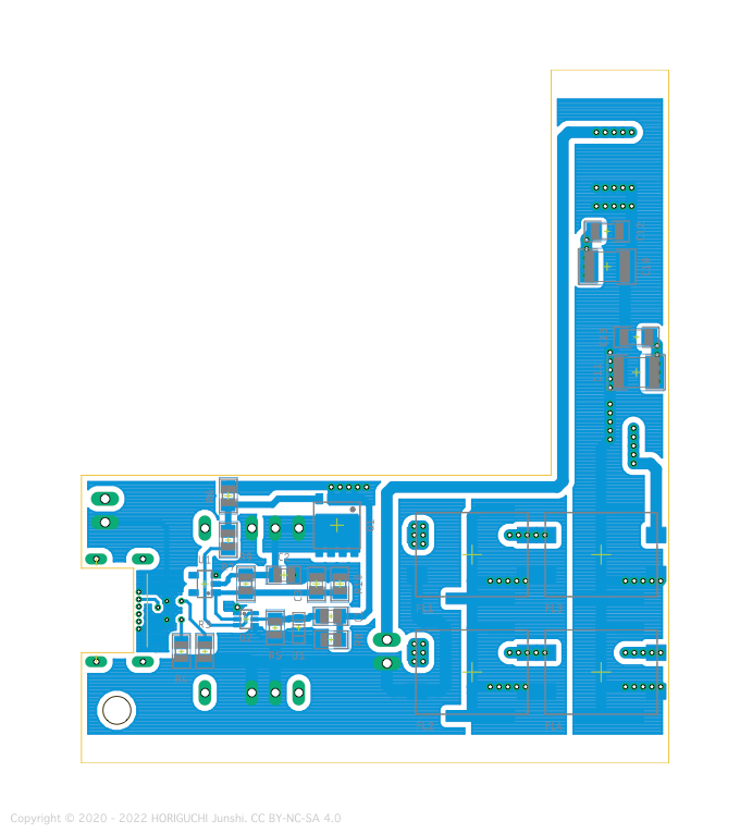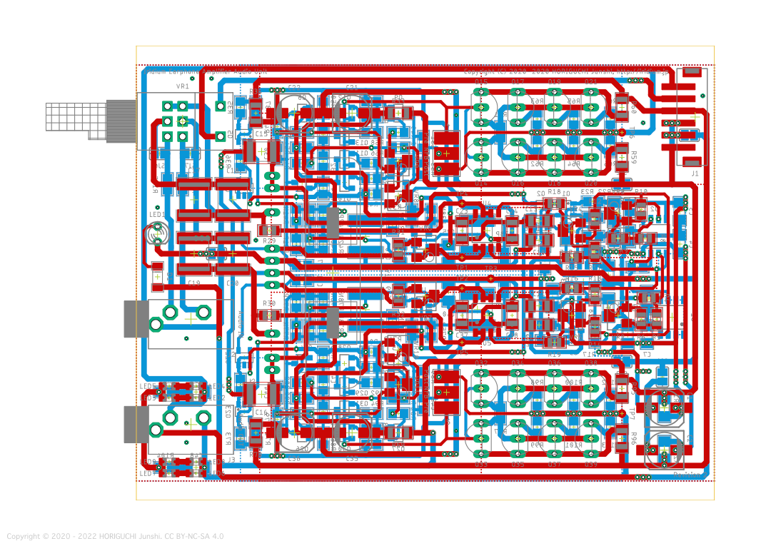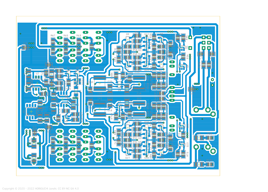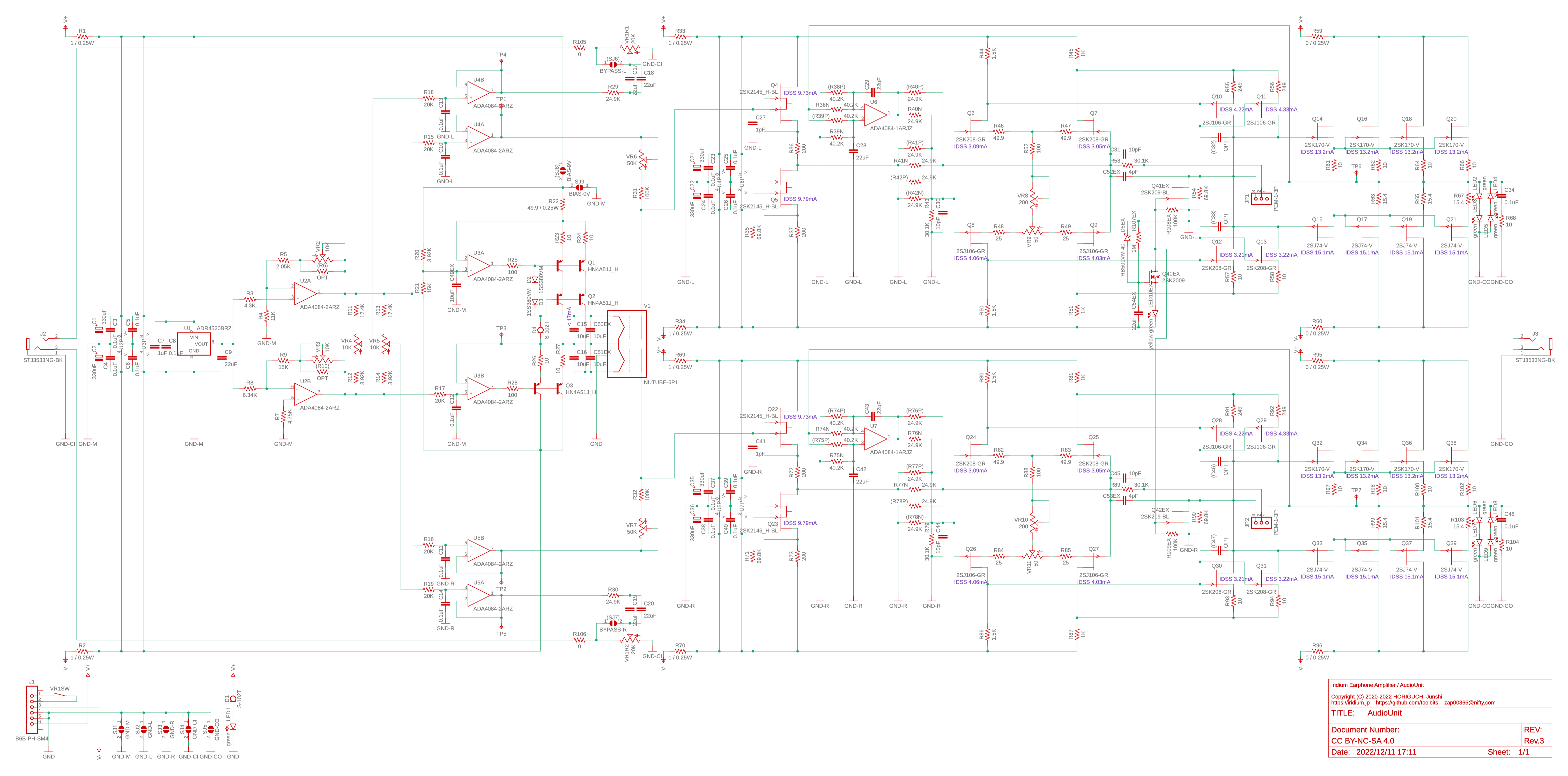 Nutube の出力バッファと反転回路には、2SK2145, 2SK208, 2SJ106 のチップ形 JFET を使用し、出力段には、2SK170-V, 2SJ74-V のリード形 JFET を4並列にプッシュプルでもちいる。出力コンデンサを使用しない OCL 構成とするため DC サーボを導入し、Nutube を定電流駆動するための定電流電源部と DC サーボには、オペアンプとチップ形バイポーラトランジスタを使用する。