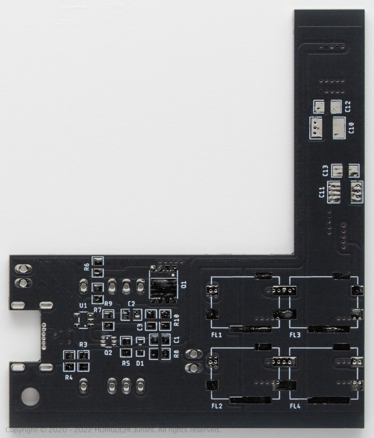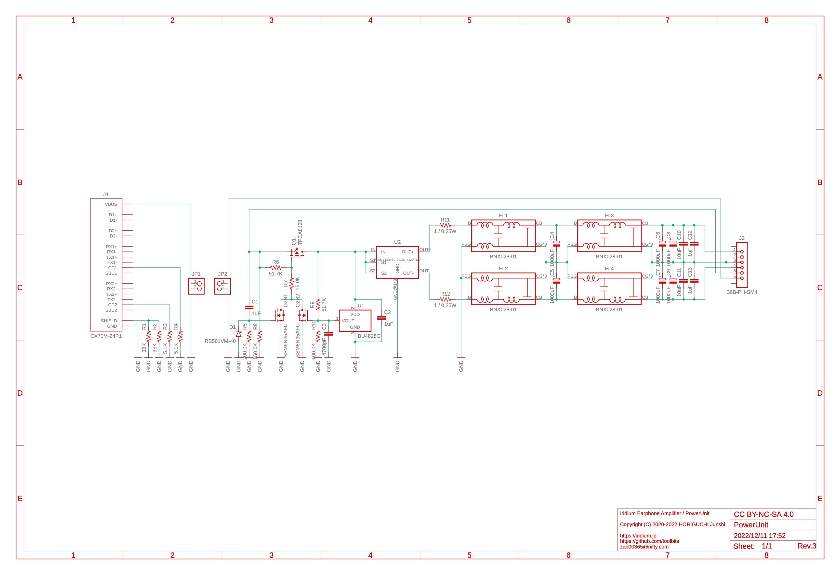 Q1 を通過した電力は、U2 の Strawberry Linux 社製の「LT3471 DC-DC コンバータモジュール (+12V/-12V)」(#12071) を ±9.1V 出力に改造 (後述) したモジュールに入力する。最後に、EMI フィルタモジュールと大容量コンデンサからなる高周波ノイズフィルタをとおしたのち、J2 より増幅・出力モジュールに対して、正負電源として電力を出力する。