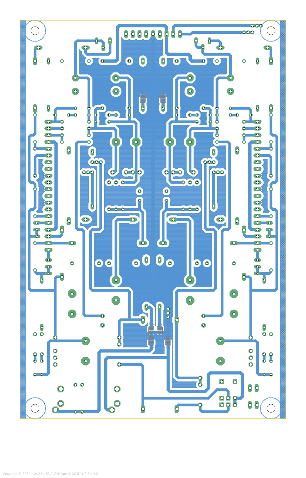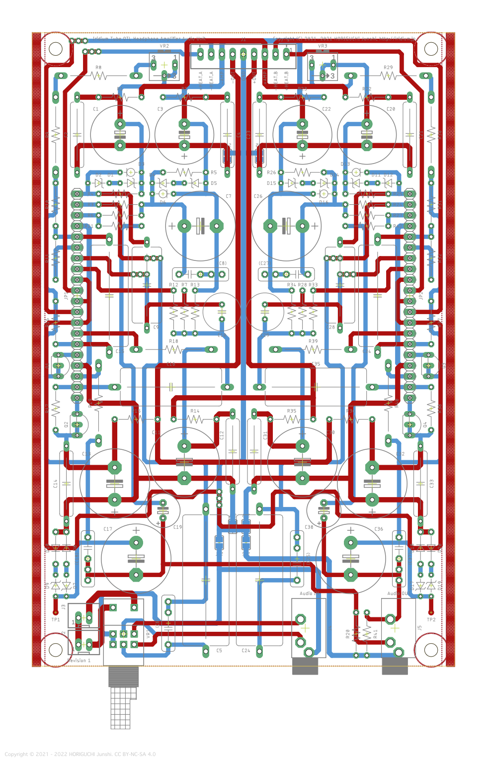 出力から C19(C38) と R21(R42) をとおして、入力段のカソードに負帰還をかける。プッシュプルのアンバランスによる出力オフセットは、VR2(VR3), R8(R29), R9(R30) をとおして供給される電流によりバランスさせる。入力をショートさせた状態で TP1(TP2) と GND 間の電圧を測定し、VR2(VR3) を調整して 0V に合わせる。0V 付近に調整できない場合は、6922 のユニット間の特性が大幅にずれている可能性が高い。