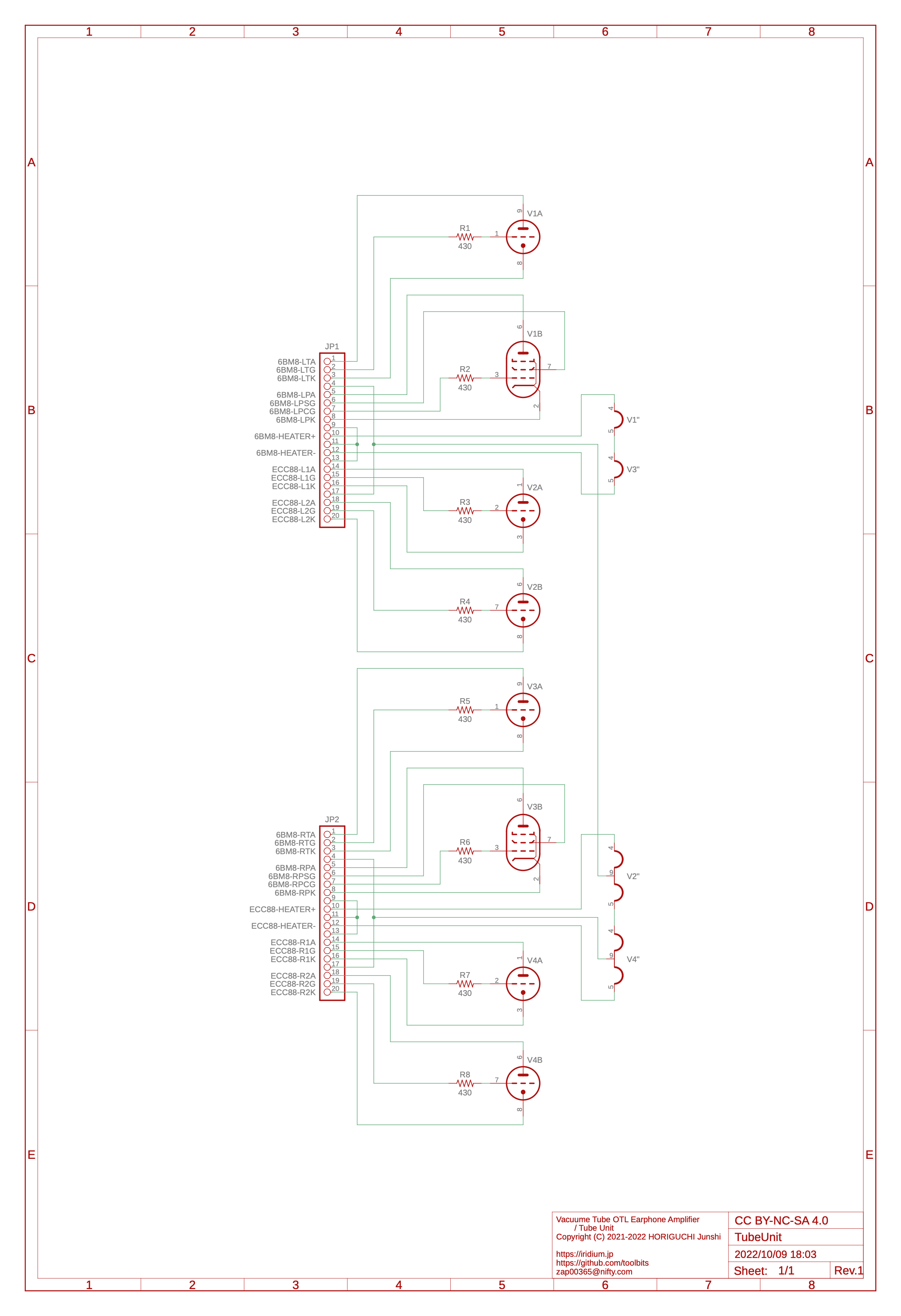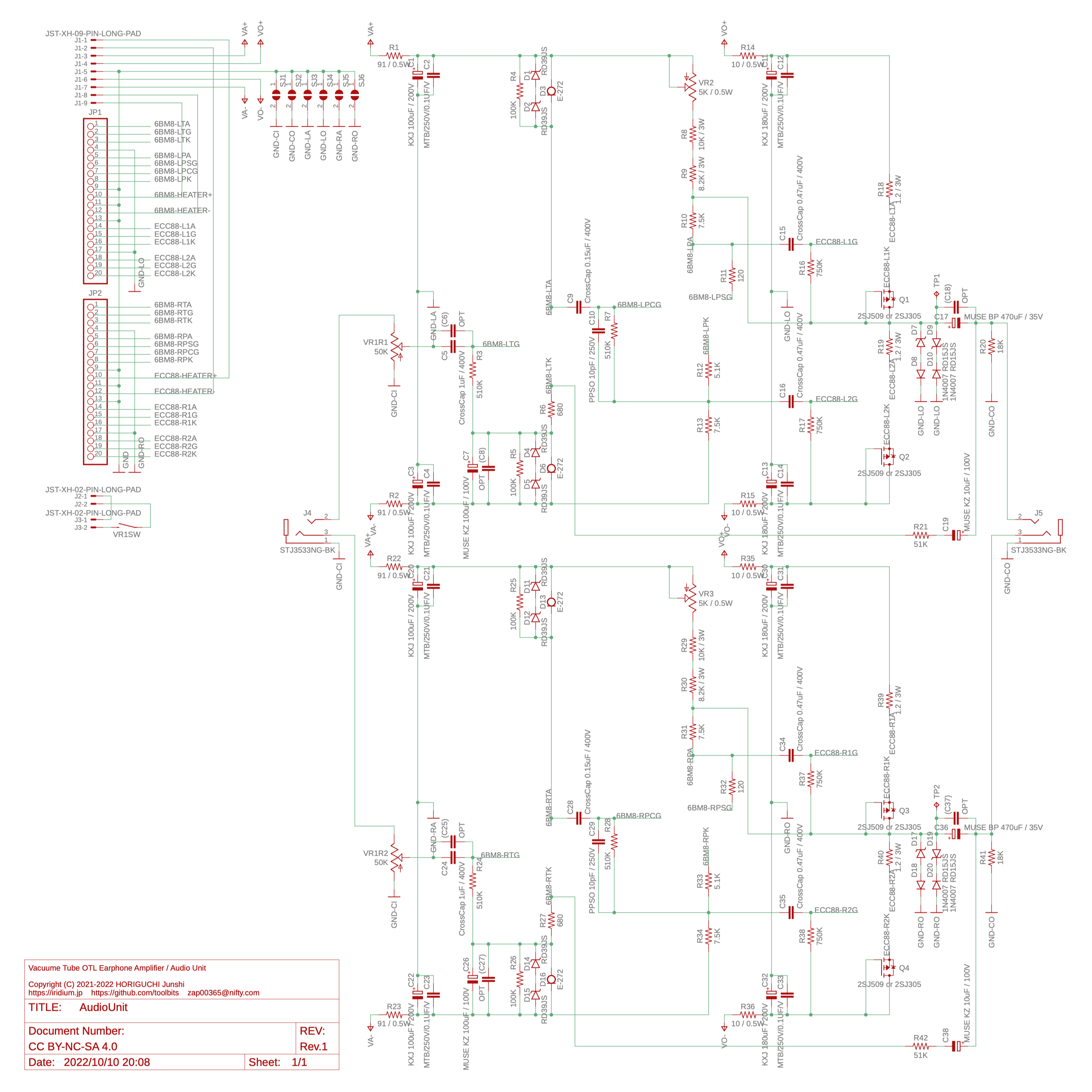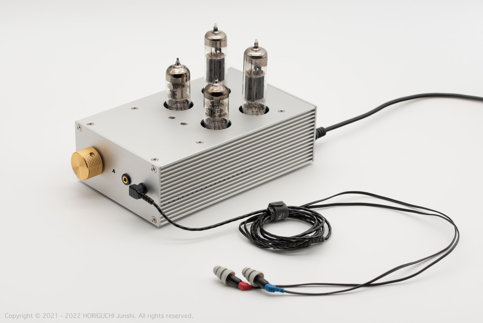 入力段を 6BM8 の3極部、ドライバ段を 6BM8 の5極部で構成し、トランスレスの出力段に 6922 をプッシュプルで使用した真空管イヤホンアンプ。