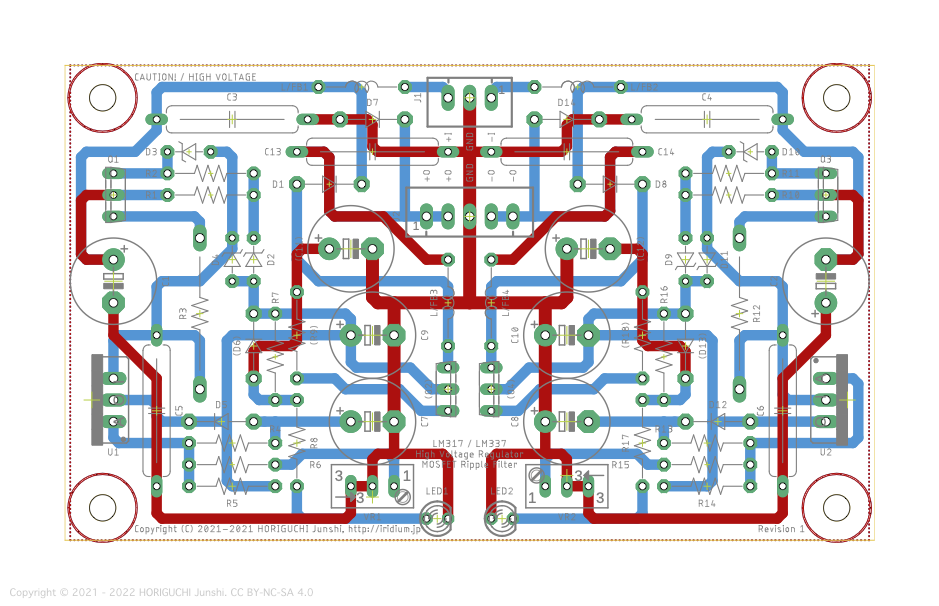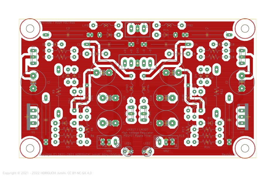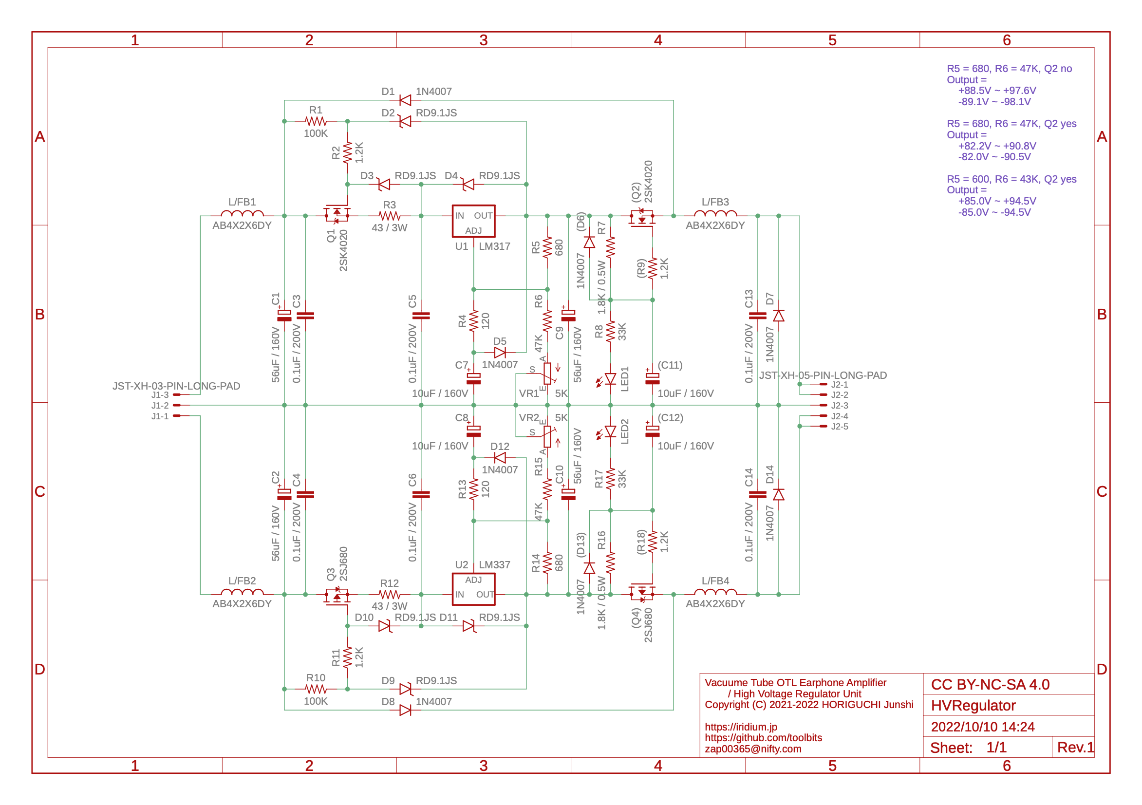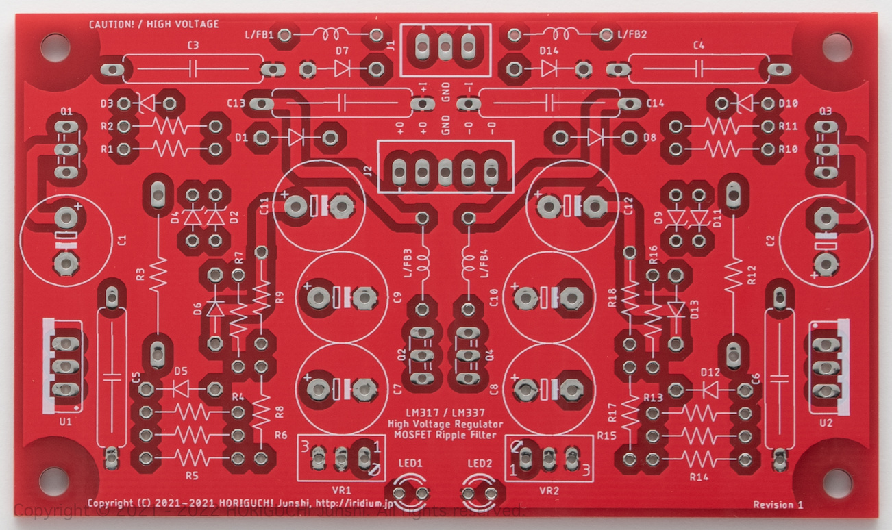 増幅・出力モジュールに供給する高電圧を安定化させるための、Maida Regulator とリップルフィルタを合体させたモジュール。LM317 と LM337 を使い正負両電圧を安定化させることができる。回路中の各種部品は耐電圧に注意を要する。