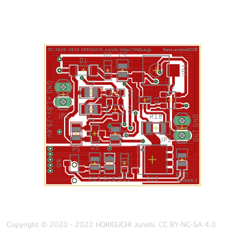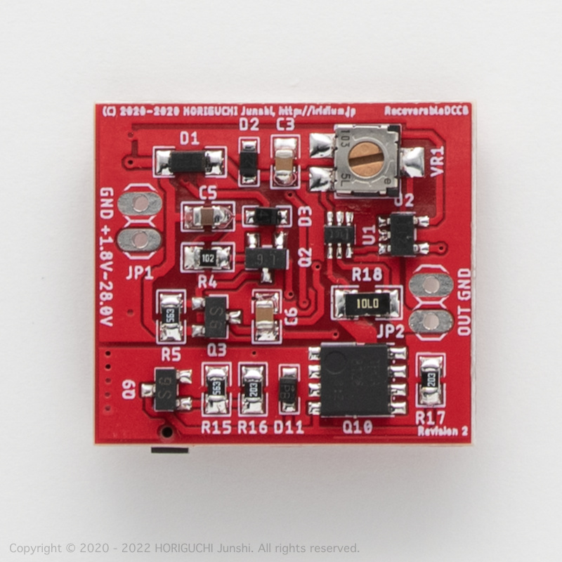 VR1 の半固定抵抗により制限電流値を最大 2.4A の範囲で設定できるが、基板の寸法を小さく設計したため 2A 程度が実用範囲である。電流検出部は、D1, D2 による簡易的な安定化電源により駆動されるため、2.4V 以下の入力時には、入力電圧の影響を受け制限電流値が低下する。
