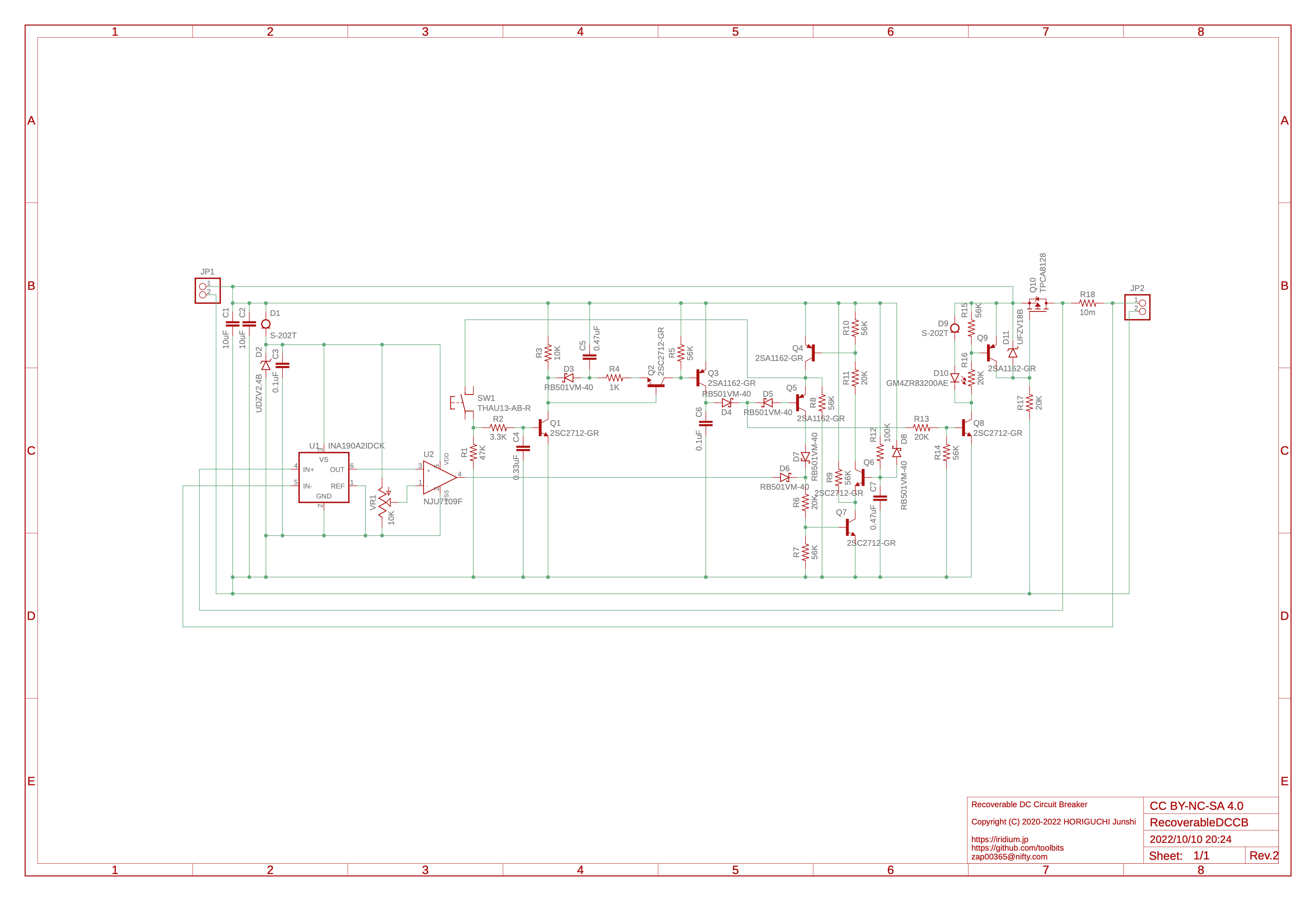 電源と負荷のあいだに挿入することにより、10mΩ の電流検出抵抗を介して過電流を検出し、出力 MOSFET を遮断する。トランジスタで組まれたラッチ回路により遮断状態は保持され、リセットスイッチを押すか、電源をオフにすることにより導通が復活する。